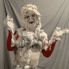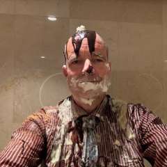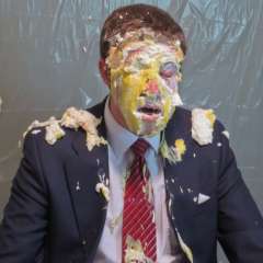 Michiganpie1 was surprised by SeymourTheClown with a big sloppy cream pie to the face
